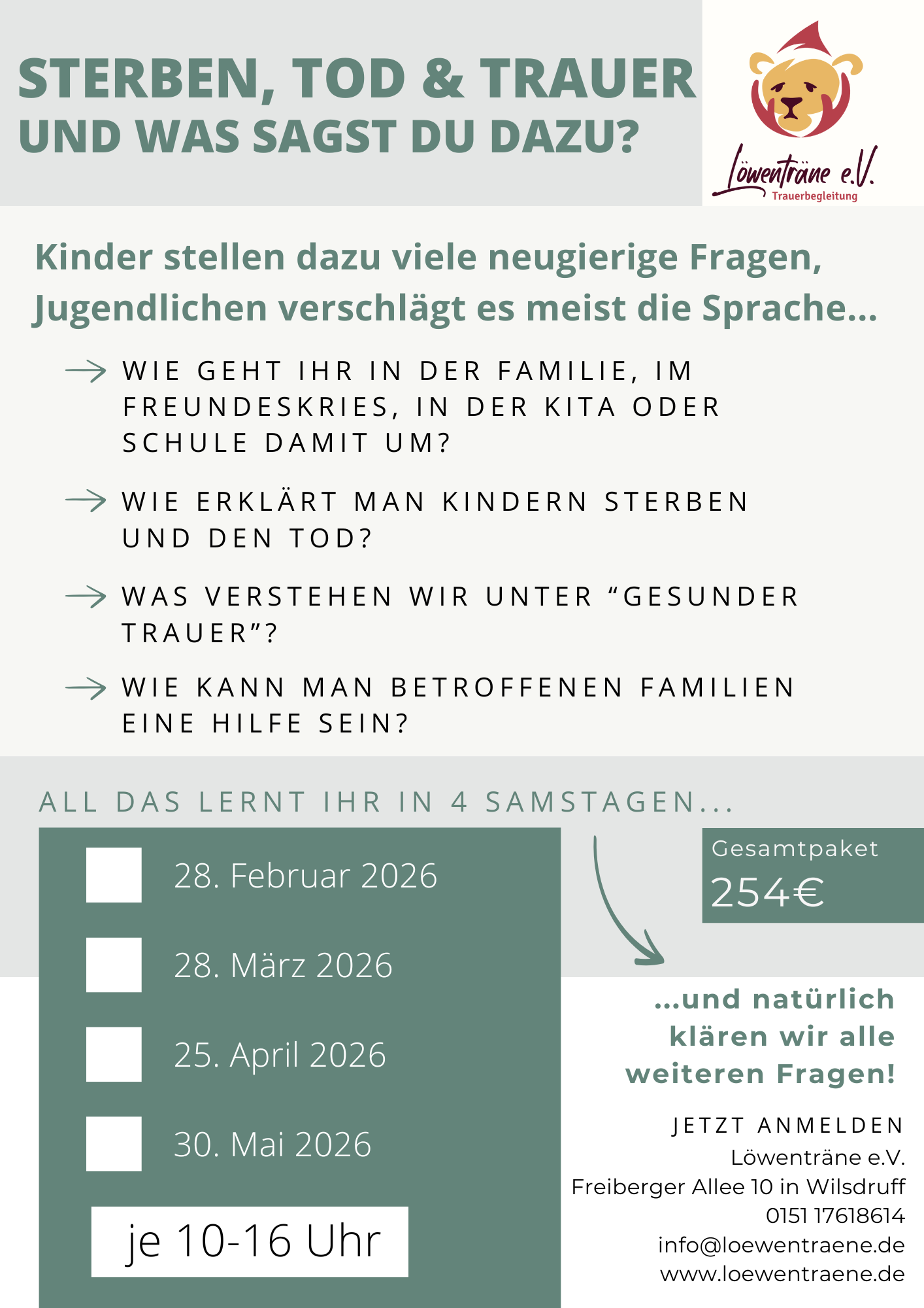 In Familien, Kitas und Schulen besteht oft Unsicherheit bei der Begegnung mit Sterben, Tod und Trauer. Wir unterstützen euch gern. Unsere Vision ist es, dass sich ein guter Umgang mit diesen Themen in unserer Gesellschaft etabliert.